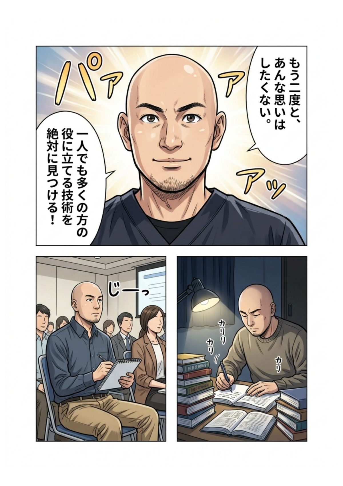 社会人時代に野球で腕に大怪我を負い、その怪我の影響で、一時、動かなくなっていた腕がリハビリによってスムーズに動くようになった事に感銘を受け、脱サラして専門学校に進学しました。
